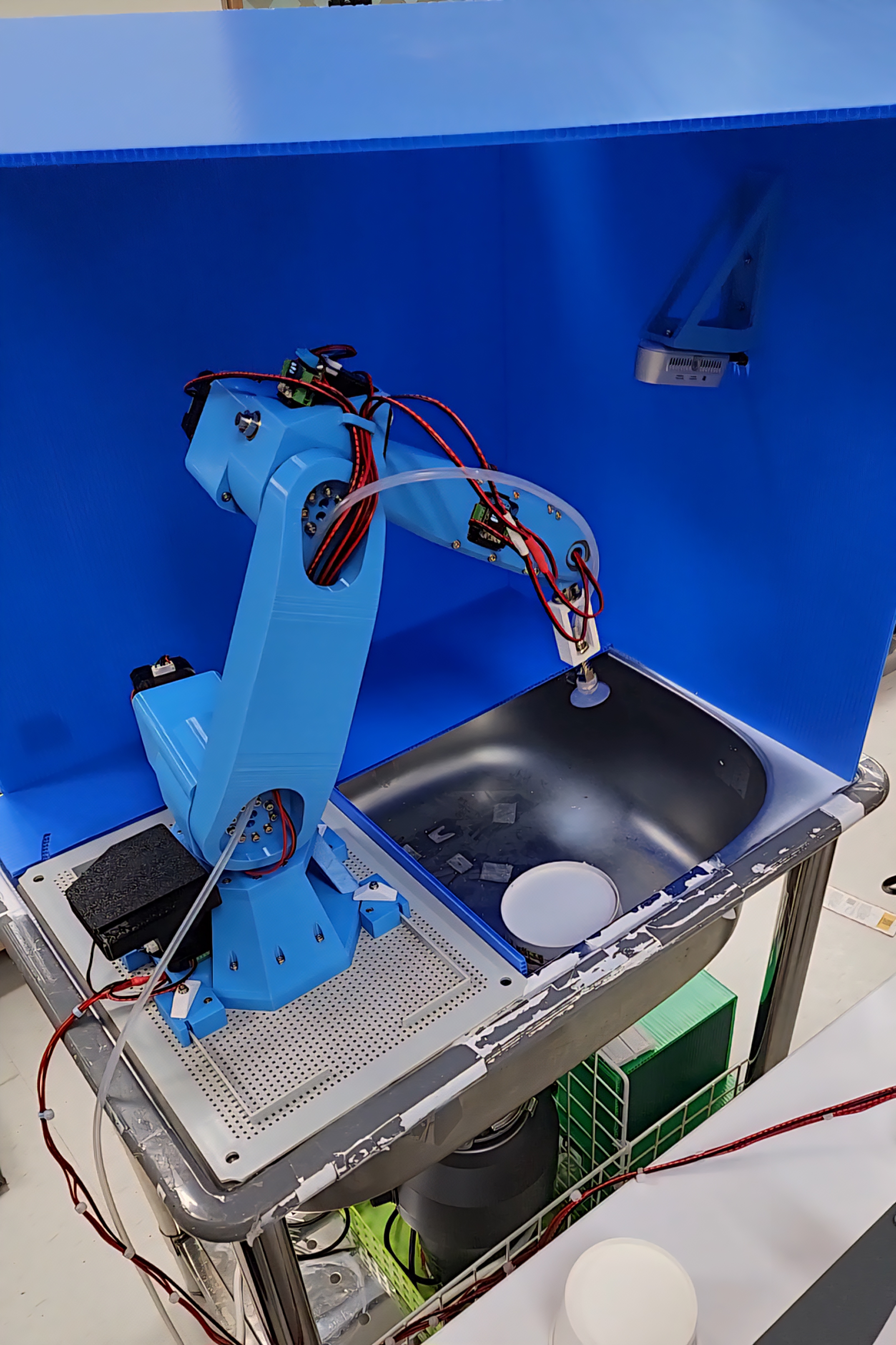 餐碗處理部分採用 Intel RealSense 深度鏡頭擷取場景影像,並使用 YOLOv8n-seg 進行物件分割,辨識餐碗的大小、形狀與位置。接著透過主控電腦計算碗面的平面位置與法向量,再以自製六軸機械手臂自動完成吸取、沖洗及堆疊分類。此流程不僅能減少人員接觸髒污餐具,也可避免回收區的堆積與異味問題。
